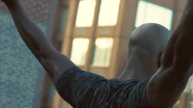 Gimbal close up of intense athlete warming up shoulders before workout