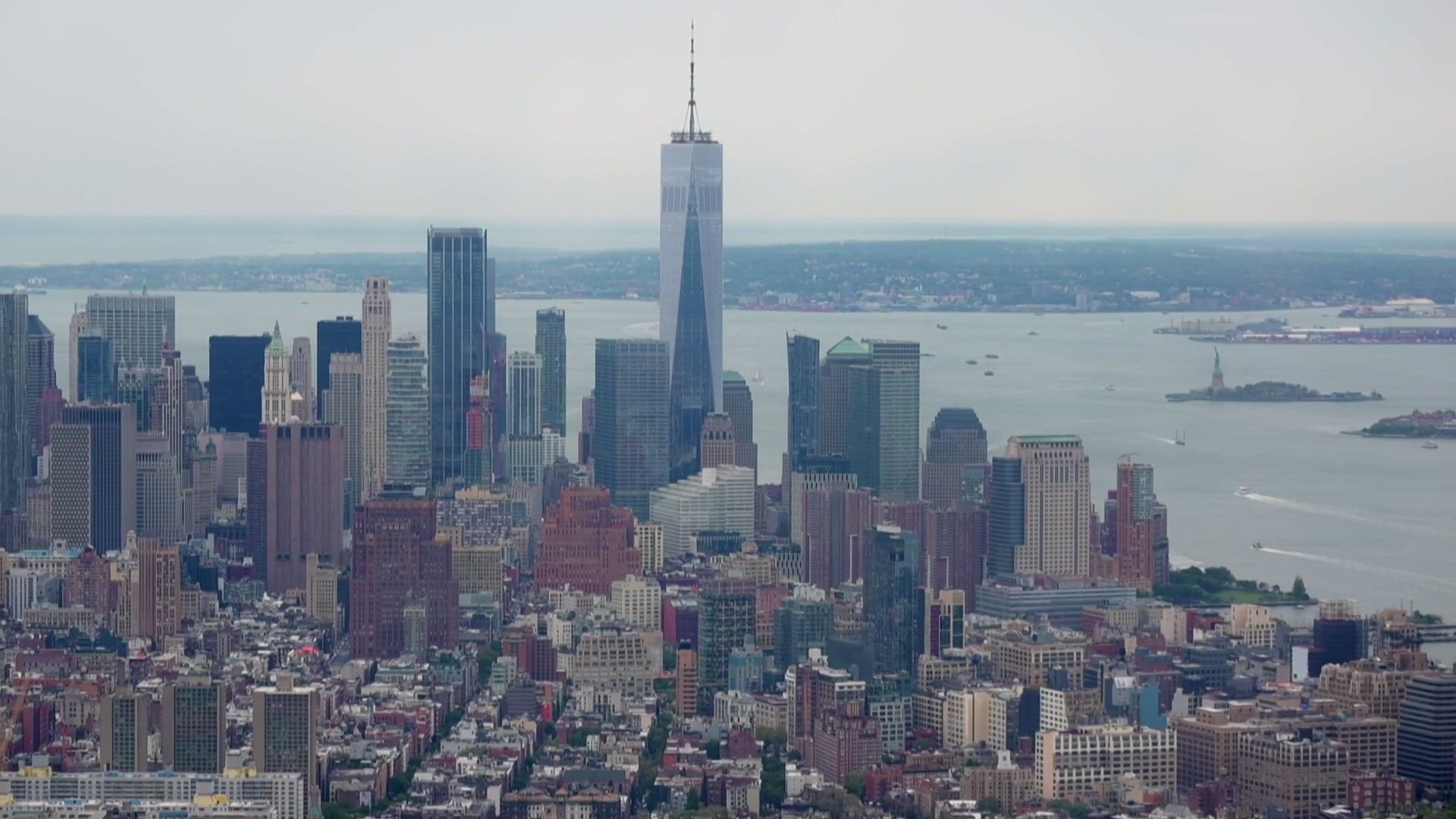 Building lights are illuminated during early twilight as the orange colored western sky is still reflected off the windows of the mid-town Manhattan skyline over the Hudson River just after sunset.