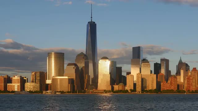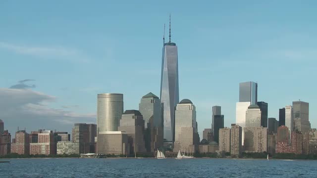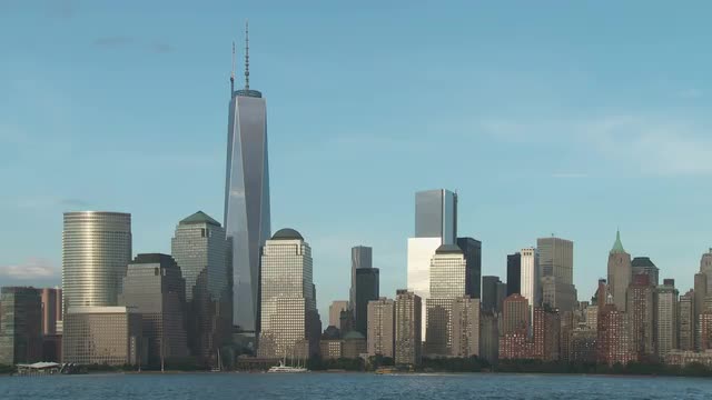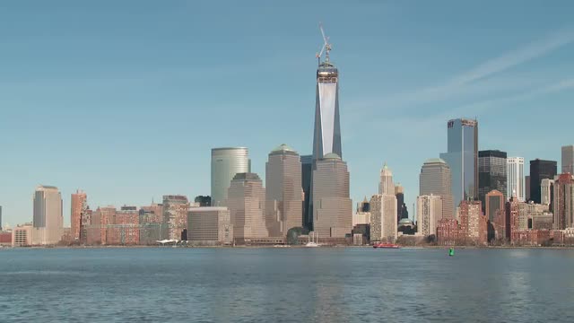 The Freedom Tower rises over the skyline of lower Manhattan in New York City on a spring afternoon.