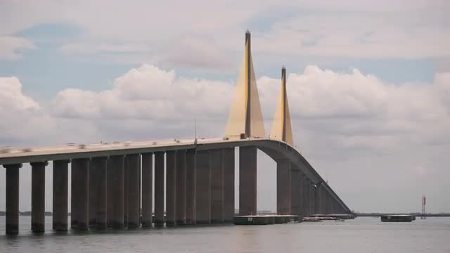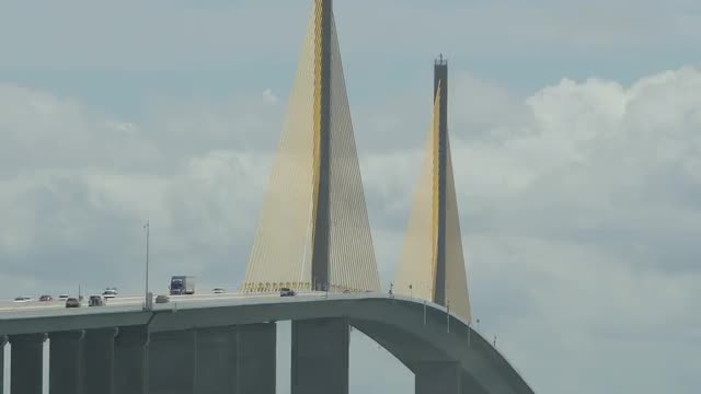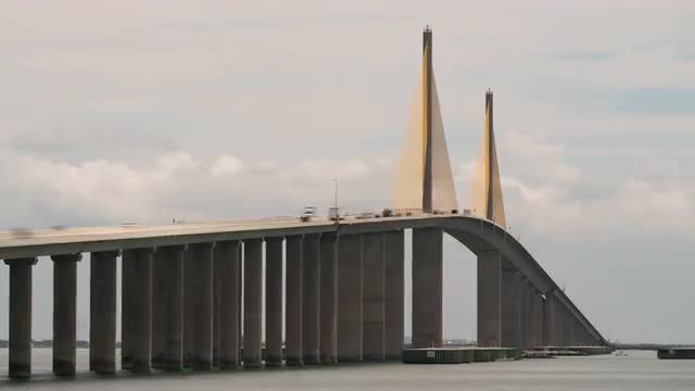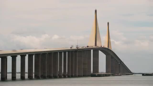 Traffic crosses the Sunshine Skyway Bridge over Tampa Bay during morning twilight, as viewed from the south fishing pier.