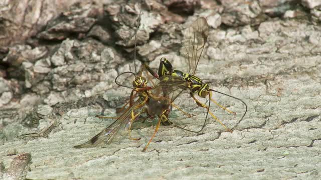A male Giant Ichneumon (Megarhyssa macrurus) wasp attempts to inseminate a female prior to her emergence in spring from inside a fallen log where she has parasitized a Pigeon Horntail (Tremex columba) larva. A male M. greenei in the background is part of this same swarm.