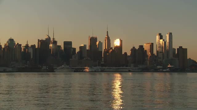 The city view during early twilight during a timelapse sequence of the Hudson River in front of the mid-town Manhattan skyline in New York City.