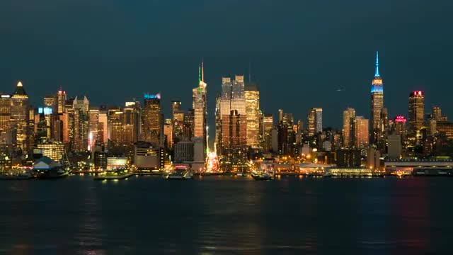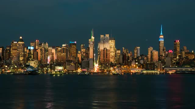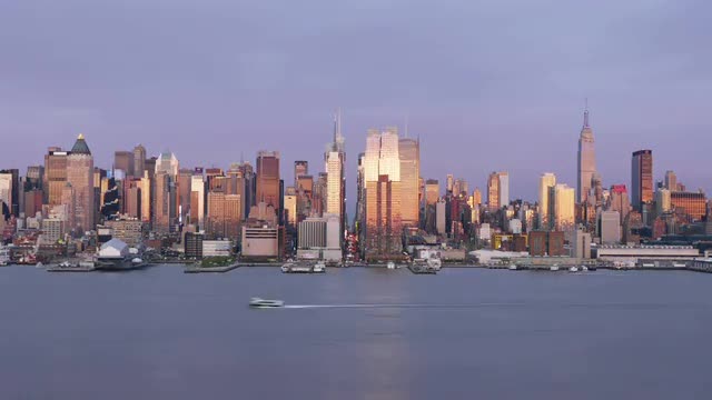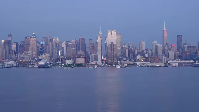 A view of the Empire State Building, Hudson River, and mid-town Manhattan skyline in New York City during late afternoon.