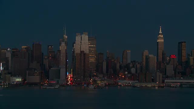 A view of the Empire State Building, Hudson River, and mid-town Manhattan skyline in New York City during late afternoon.