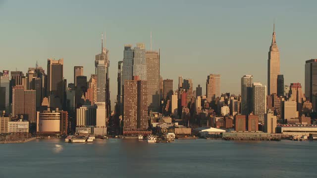 A view of the Empire State Building, Hudson River, and mid-town Manhattan skyline in New York City during late afternoon.