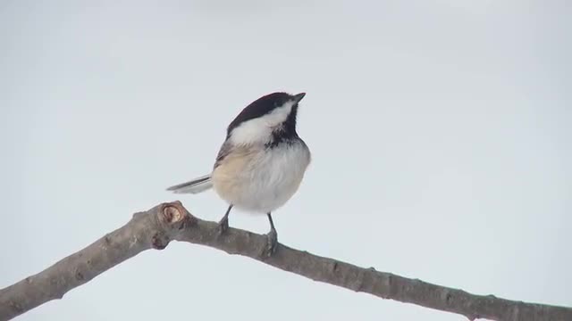 A Black-capped Chickadee (Poecile atricapillus) perches on a tree limb and takes flight in winter.