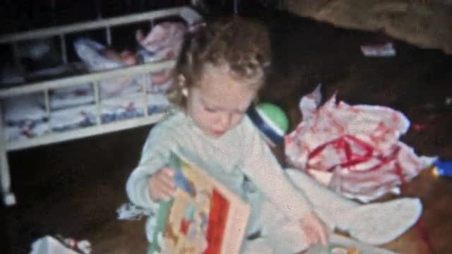 BOULDER, COLORADO 1951: Girl opening Christmas gift coloring book and other.