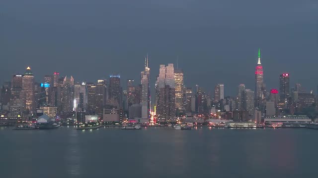(Time-lapse) The city transitions from twilight into night as the lights of the mid-town Manhattan skyline are illuminated behind the Hudson River in New York City. The Empire State Building lights were Red/White/Green in honor of the National Italian American Foundation.