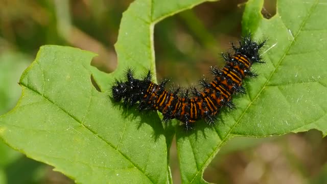 A Baltimore Checkerspot (Euphydryas phaeton) caterpillar feeds on vegetation in spring.