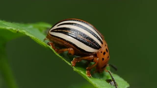 A False Potato Beetle (Leptinotarsa juncta) feeds on a Bittersweet Nightshade leaf.