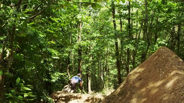 Huge jump of a mountain bike rider. Shot with RED Epic.