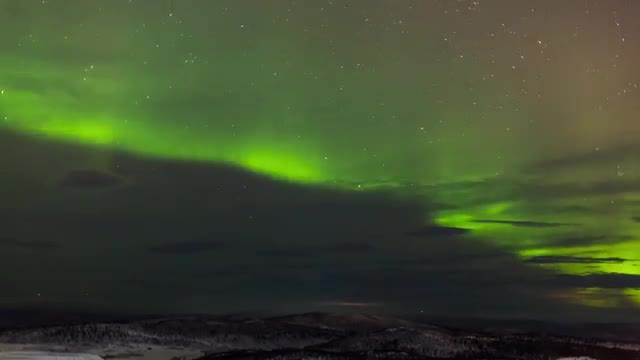 A time lapse of the stunning Northern Lights over a snowy valley in Kiruna, Sweden. The camera tilts upward, shifting from a view in which the tree-filled valley takes up half the camera's view as the aurora shimmers a bright green above, to one in which the aurora and the clear, starry night sky are all that we se.