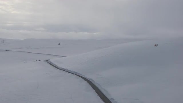 Aerial footage of helicopters flying low over western Norway in winter.