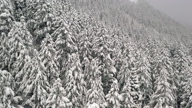 1049914 - Flying over snow covered tree tops covering mountainside in winter
