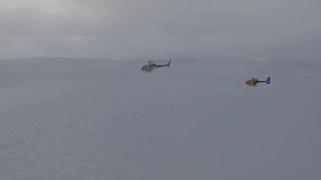 Aerial footage of helicopters flying low over western Norway in winter.