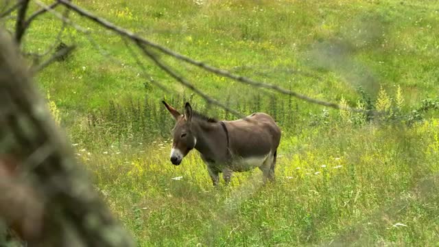 Donkey walking in a grass field. Shot with RED Epic.