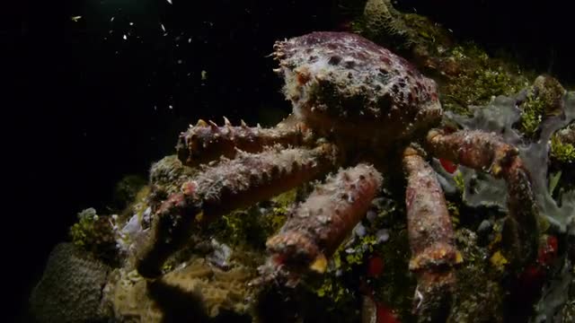 Back of a crab shell as it moves along at night, walking across the ocean floor to an escape