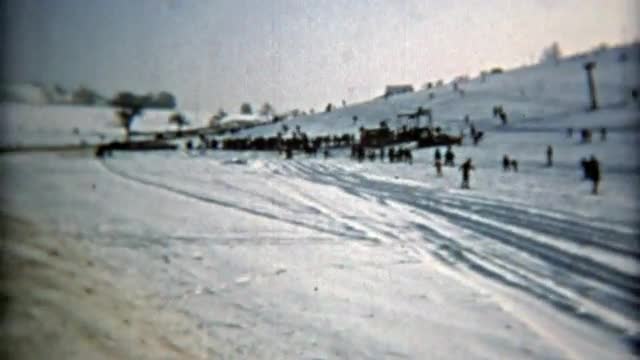 > ELDORA, COLORADO 1967: Ski resort parking lot cars skis laid out everywhere.