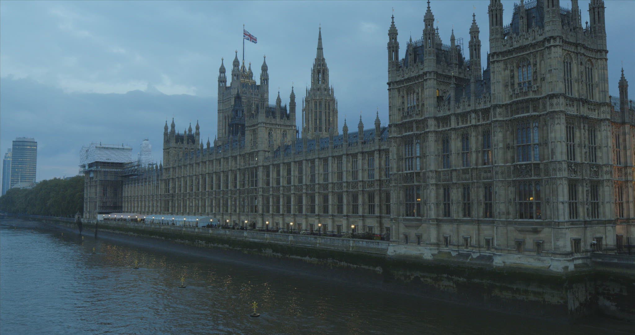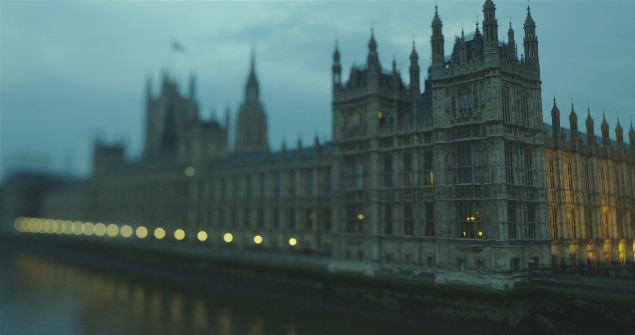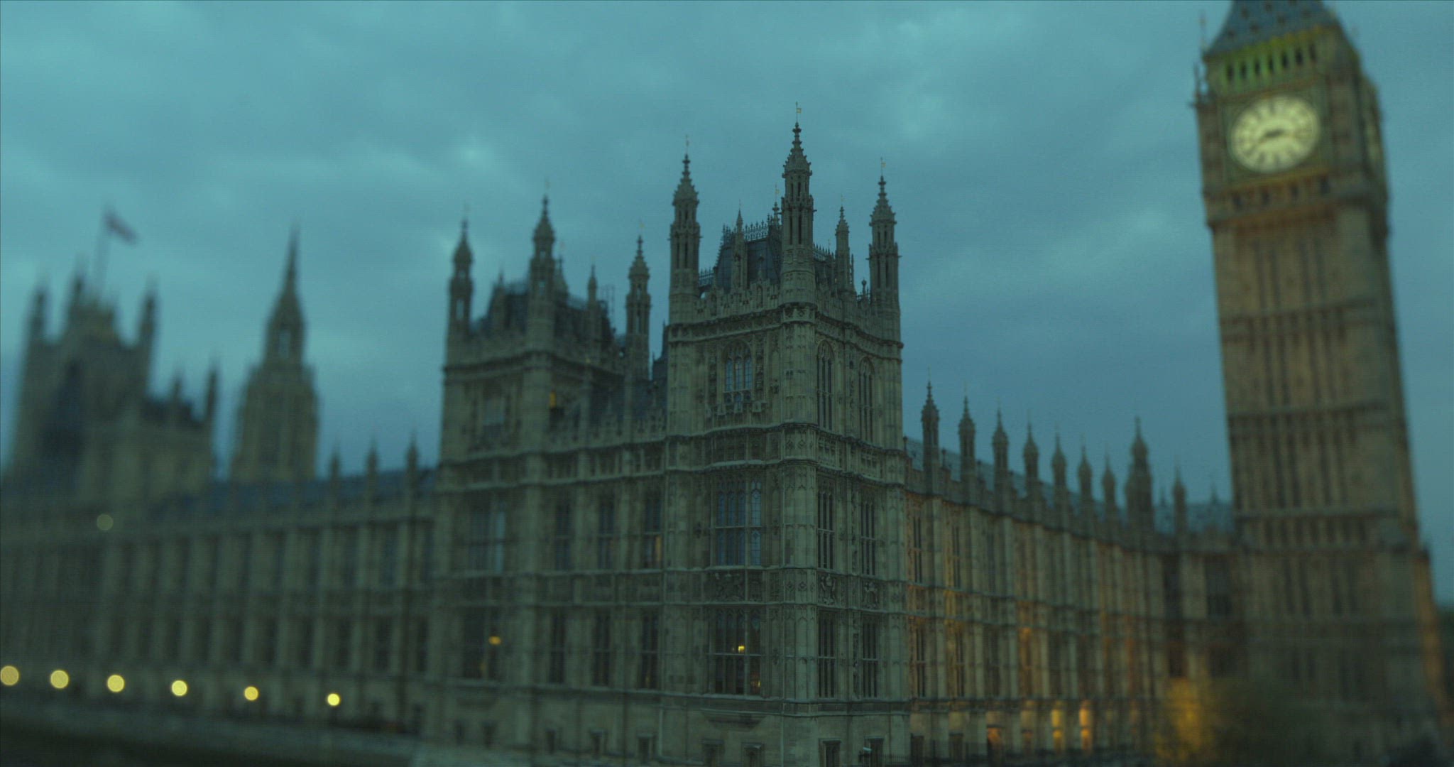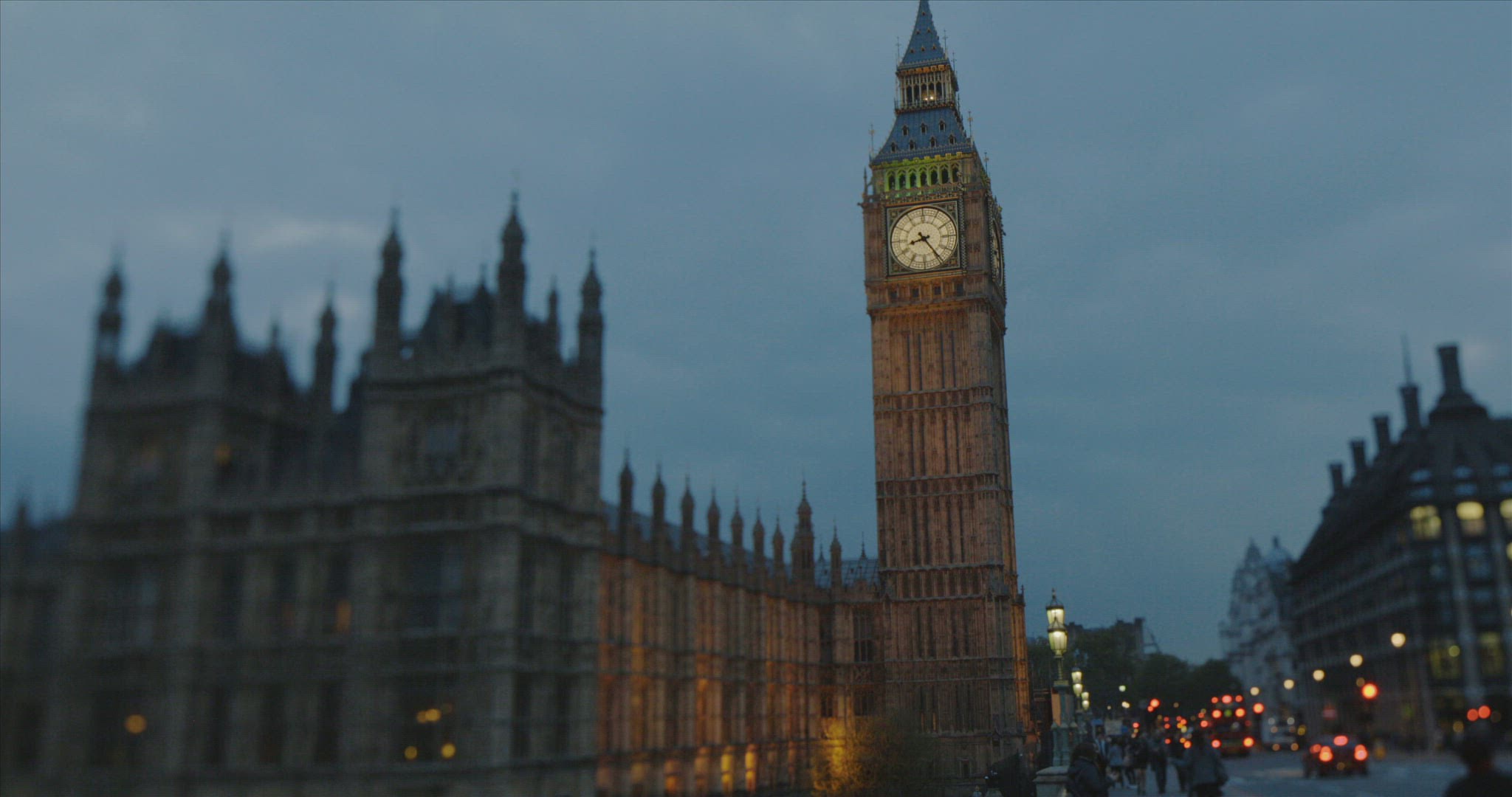 The clock tower of the Houses of Parliament, known as Big Ben, at night. Filmed from Trafalgar Square and looking down Whitehall the centre of United Kingdom Government. Traffic flows through the road including black cabs and red buses.
