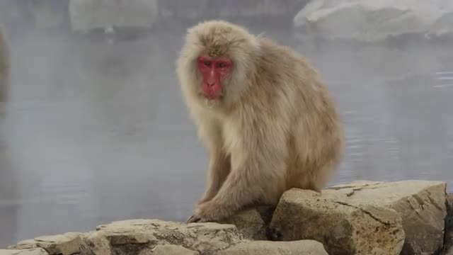 A sad looking snow monkey sits by a natural hot springs pool and looks about itself