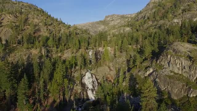 Flying over trees to and past a waterfall in fast motion.