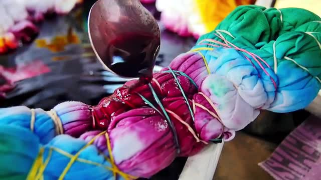 1114671 - Colored painted hippie t-shirts rolled in a rubber band where with a spoon the colors of different