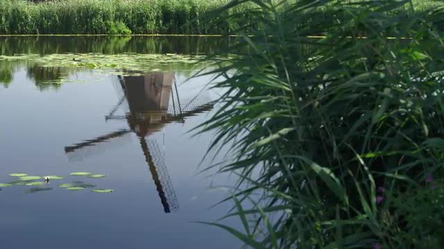 The reflection of a windmill in still water