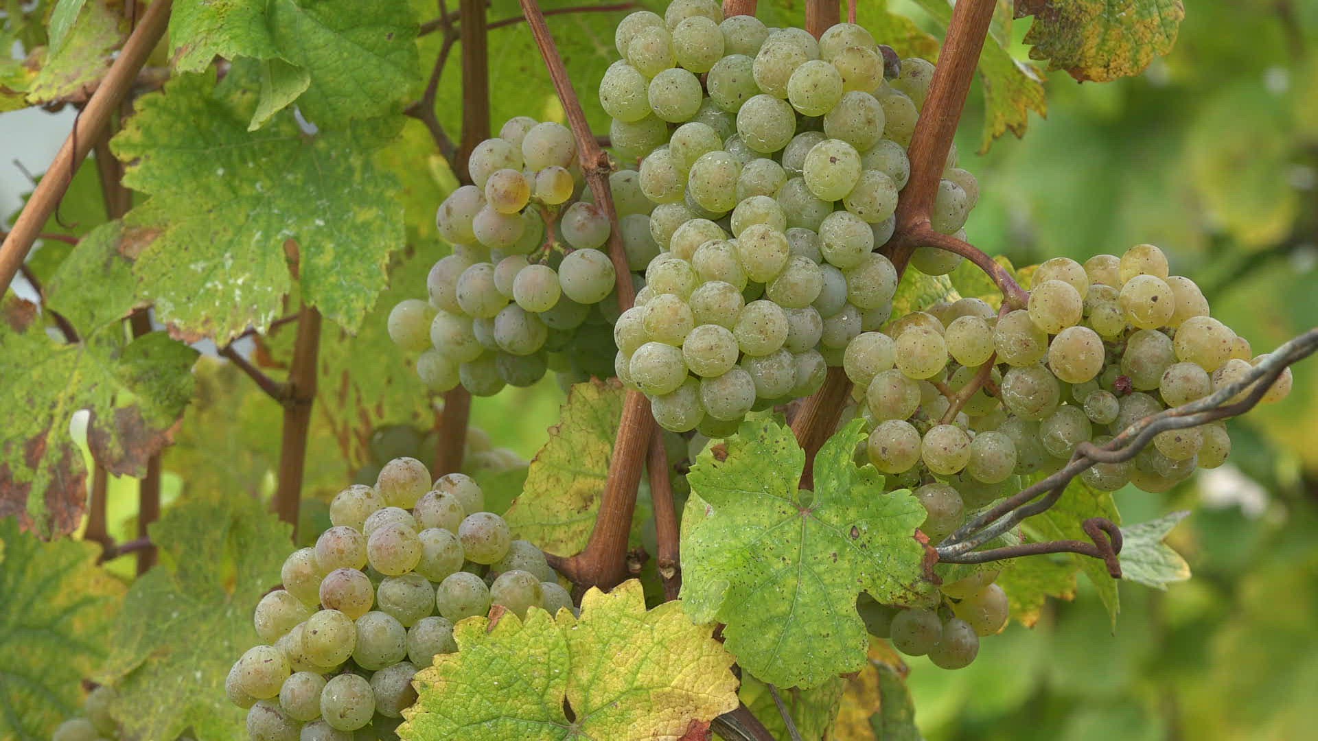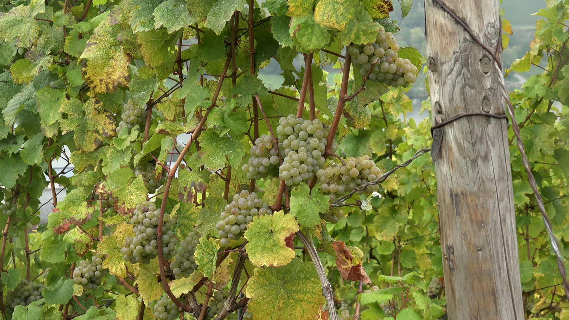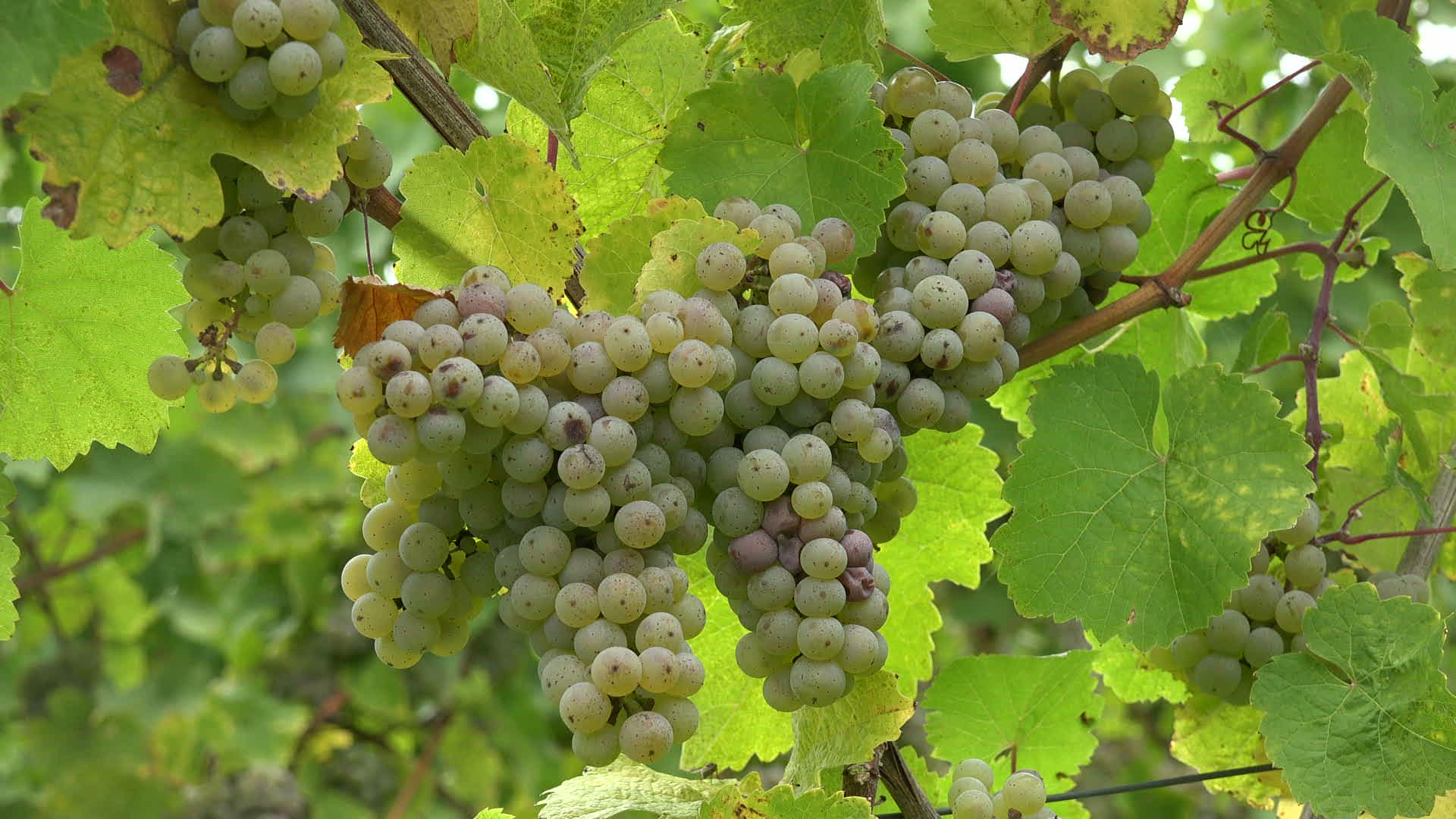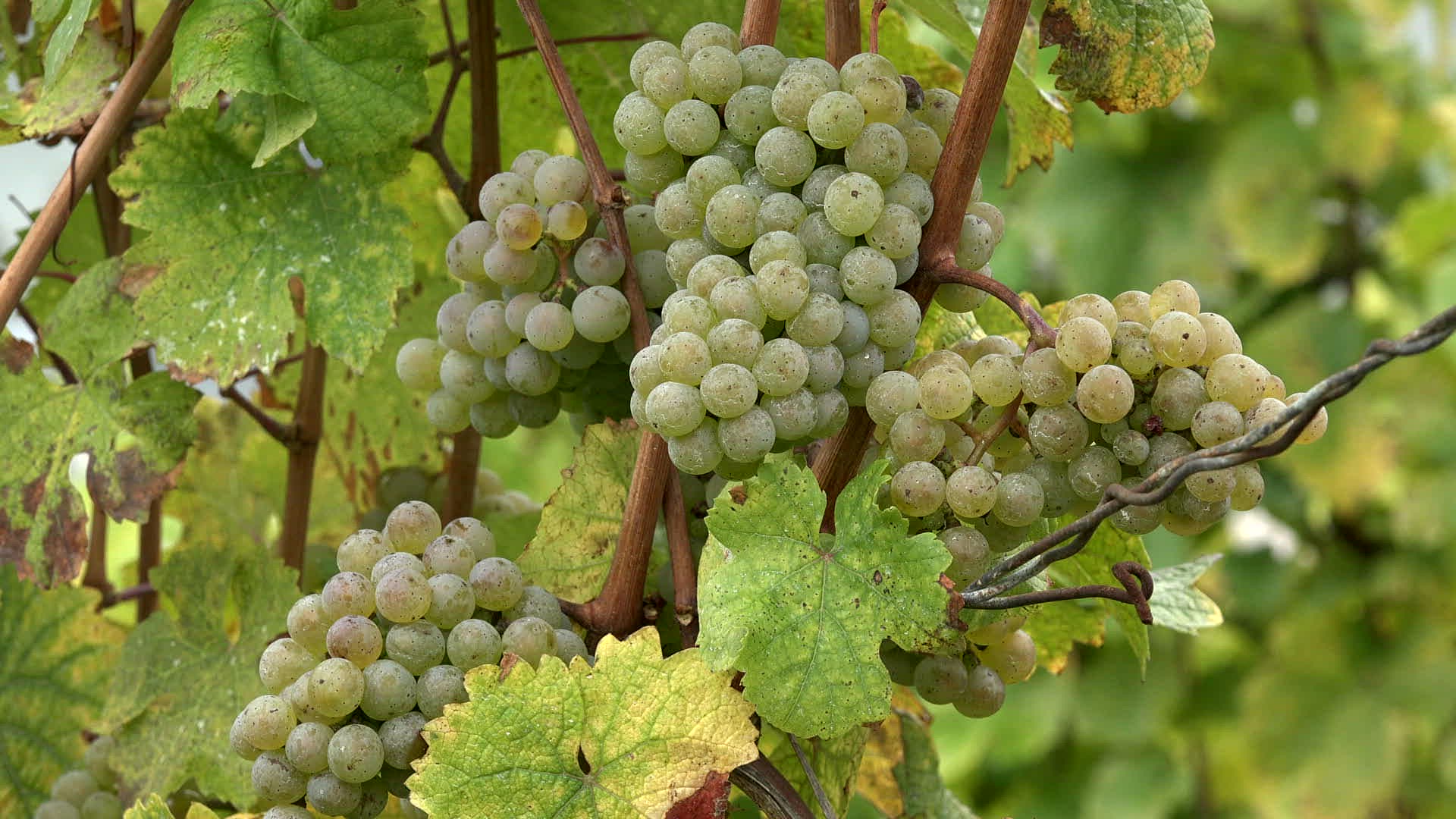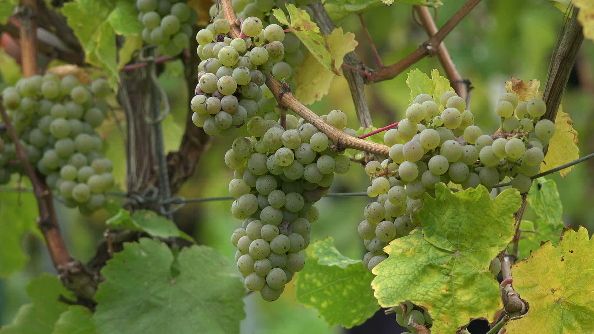 Bunches of red wine grapes hang from a lush green vine, rack focus