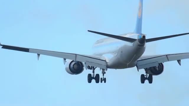 FRANKFURT AM MAIN, GERMANY - SEPTEMBER 6, 2015: Lufthansa Embraer ERJ-190LR D-AECA approaching on runway 25R, slow motion. Unofficial spotting in Fraport on Sep. 6, 2015