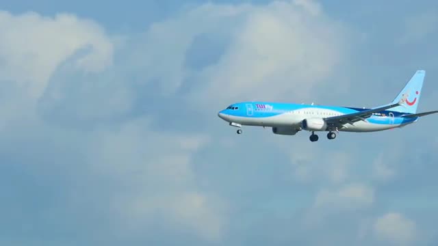 FRANKFURT AM MAIN, GERMANY - SEPTEMBER 4, 2015: TUIfly Boeing 737 D-ATUO approaching on runway 25R. Unofficial spotting in Fraport on Sep. 4, 2015