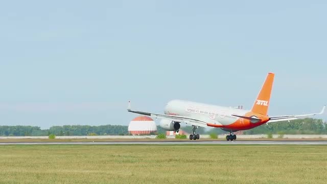 Boeing 767 take-off at Tolmachevo airport, Novosibirsk. Slow motion.