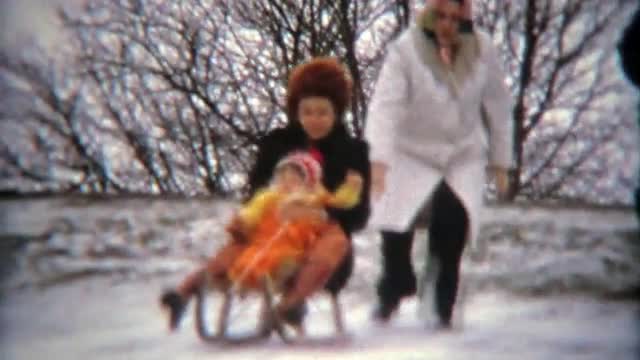> MONTREAL, CANADA 1975: Family dangerously winter snow sledding with young son.