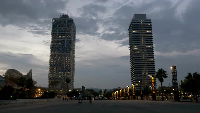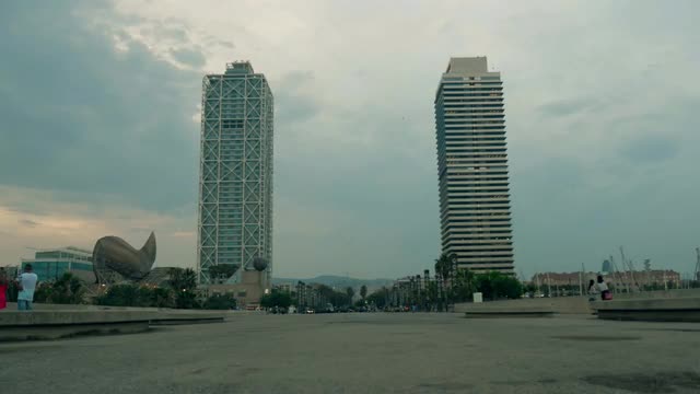 > detail of Barceloneta beach and Barcelona sky line from the sea