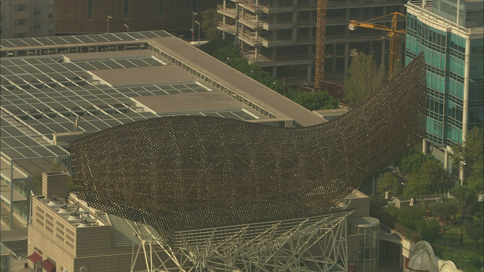 163128 - Tilt down to a beautiful performing arts hall in Barcelona, Spain.