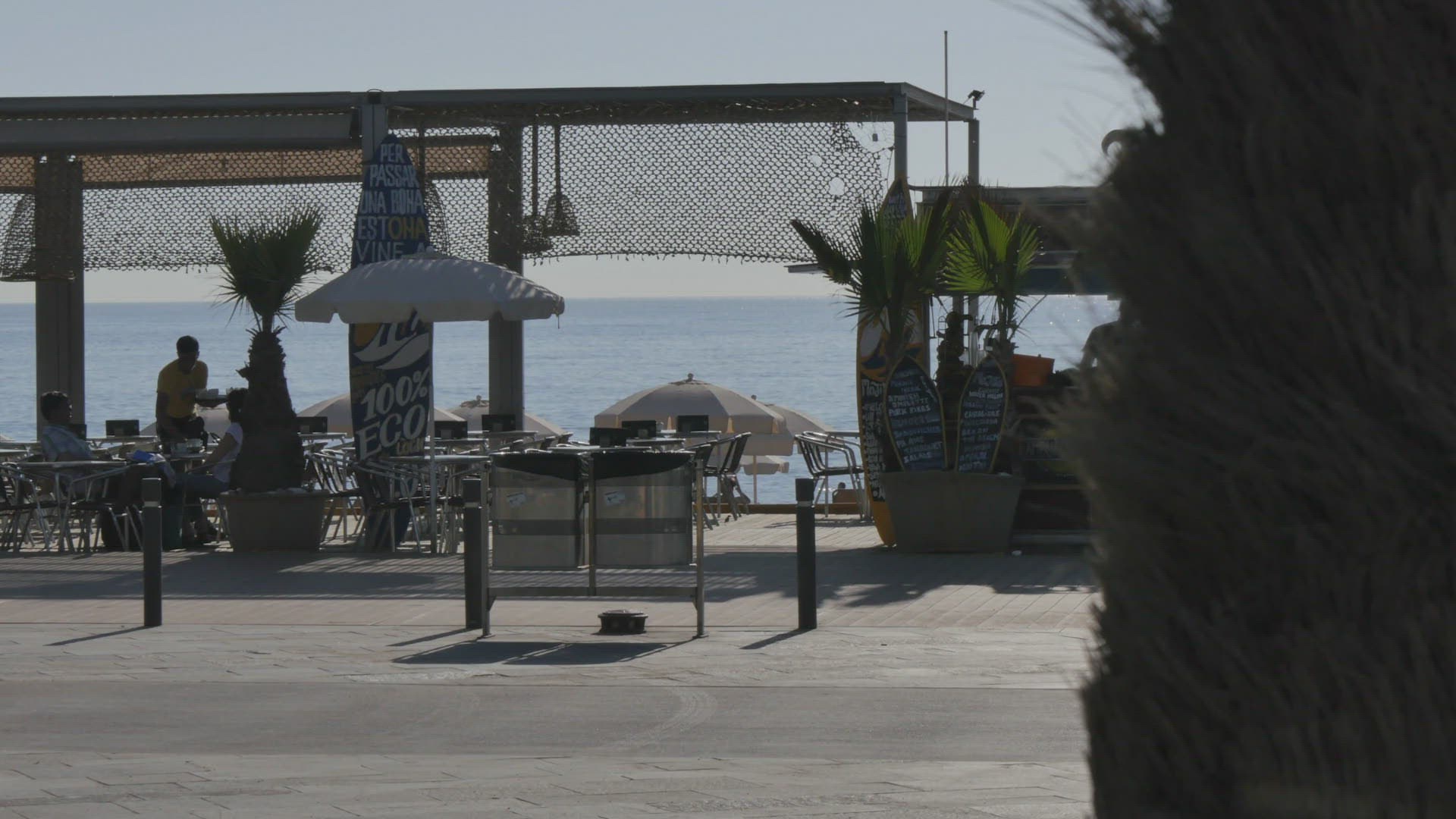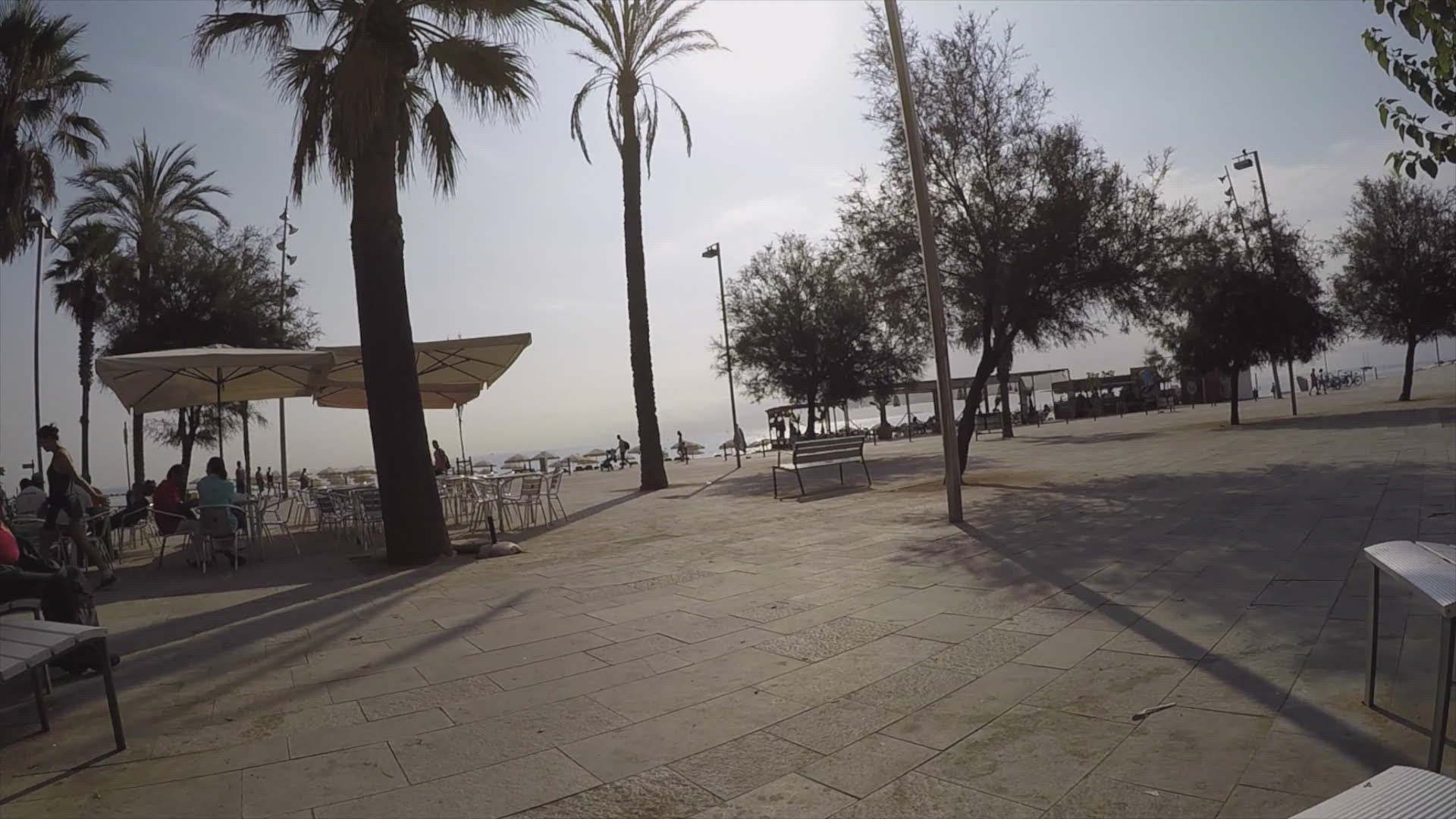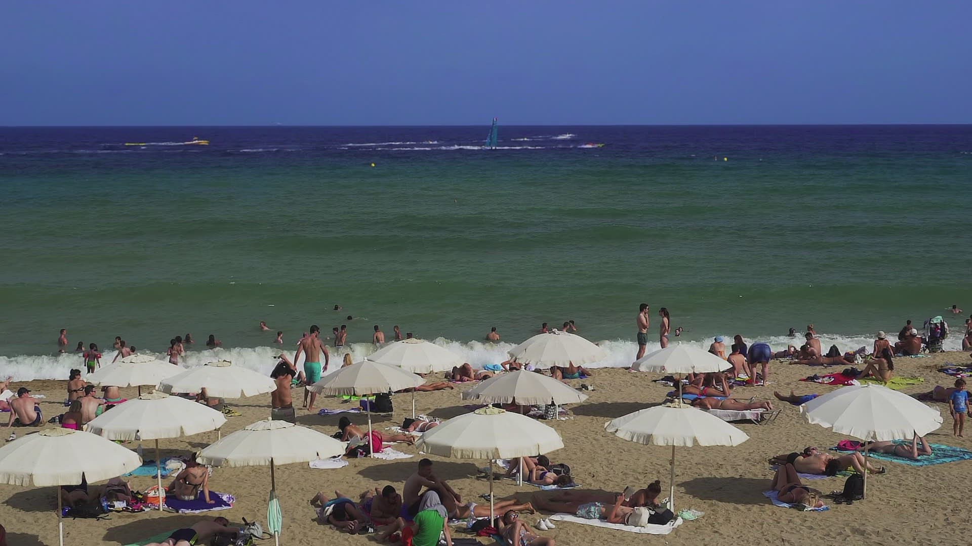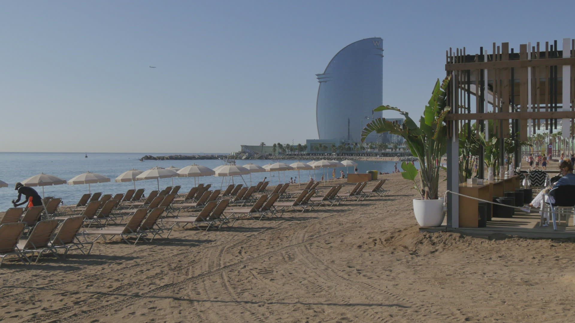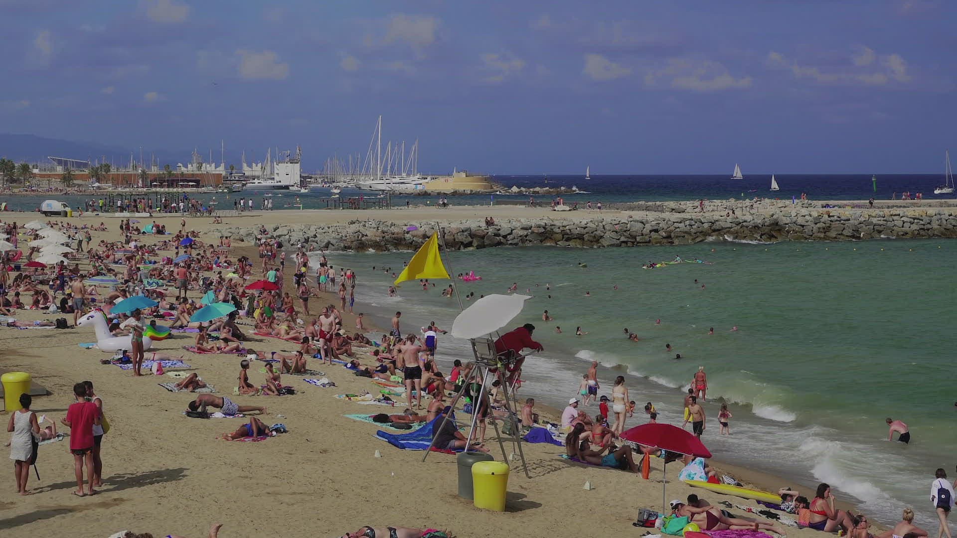 > Sailboat near Port Olimpic and Barcelona Skyline at dusk