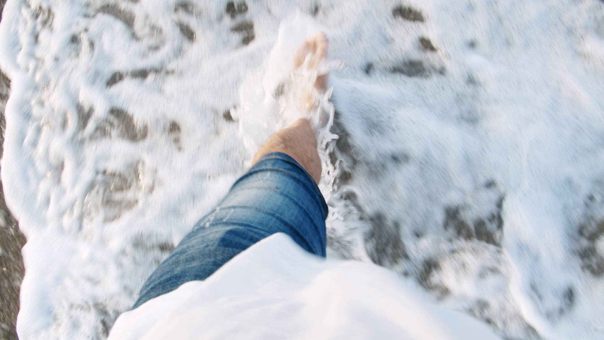 A close-up shoot on the surfers feet in the sunset when he is paddling out