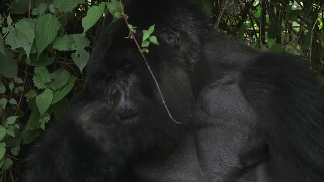 An adolescent gorilla stares at the camera and then turns to play with a silverback in Rwanda's Volcanoes National Park.