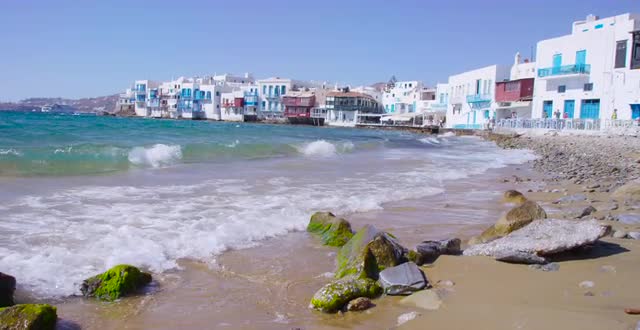 537568 - Ocean wall White tables and chairs Cruise ship Mykonos Greece.