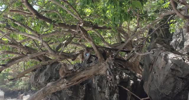 Macaque monkeys moving through the jungle by a river in Thailand