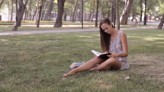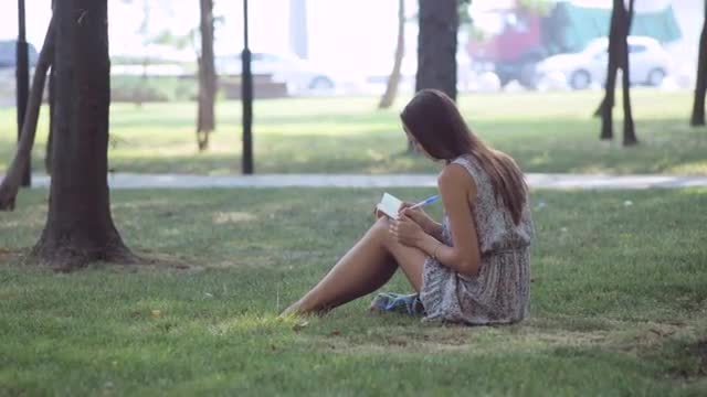 737051 - Young woman writes in her diary in the park
