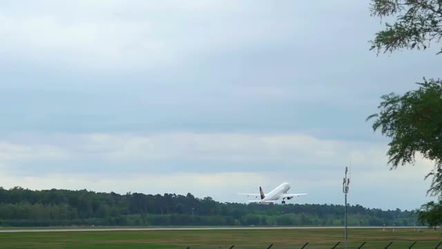 FRANKFURT AM MAIN, GERMANY - SEPTEMBER 5, 2015: Lufthansa Airbus 320 taking off at runway18, slow motion. Unofficial spotting in Fraport on Sep. 5, 2015