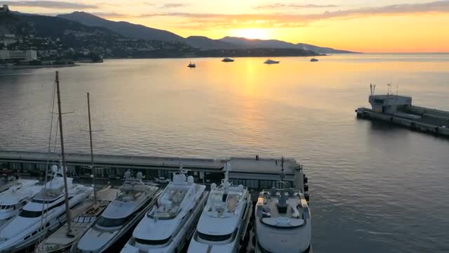Aerial Monte Carlo sunrise Mediterranean Pier luxury yacht