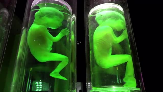 352137 - Alien babies on display in jars 4k