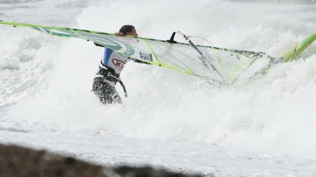 > Windsurfer entering the shorebreak