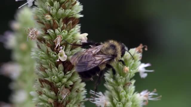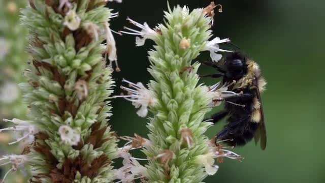 558416 - Bee foraging on Hyssop flower stem, profile shot