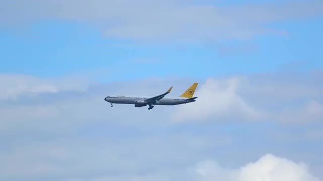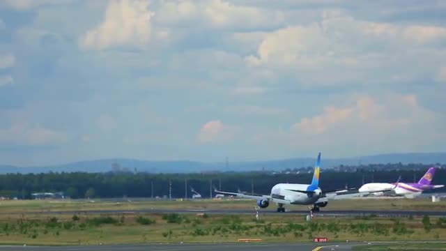FRANKFURT AM MAIN, GERMANY - SEPTEMBER 5, 2015: Condor Boeing 767 D-ABUI accelerate and take-off at runway18 ,rainy weather. Unofficial spotting in Fraport on Sep. 5, 2015