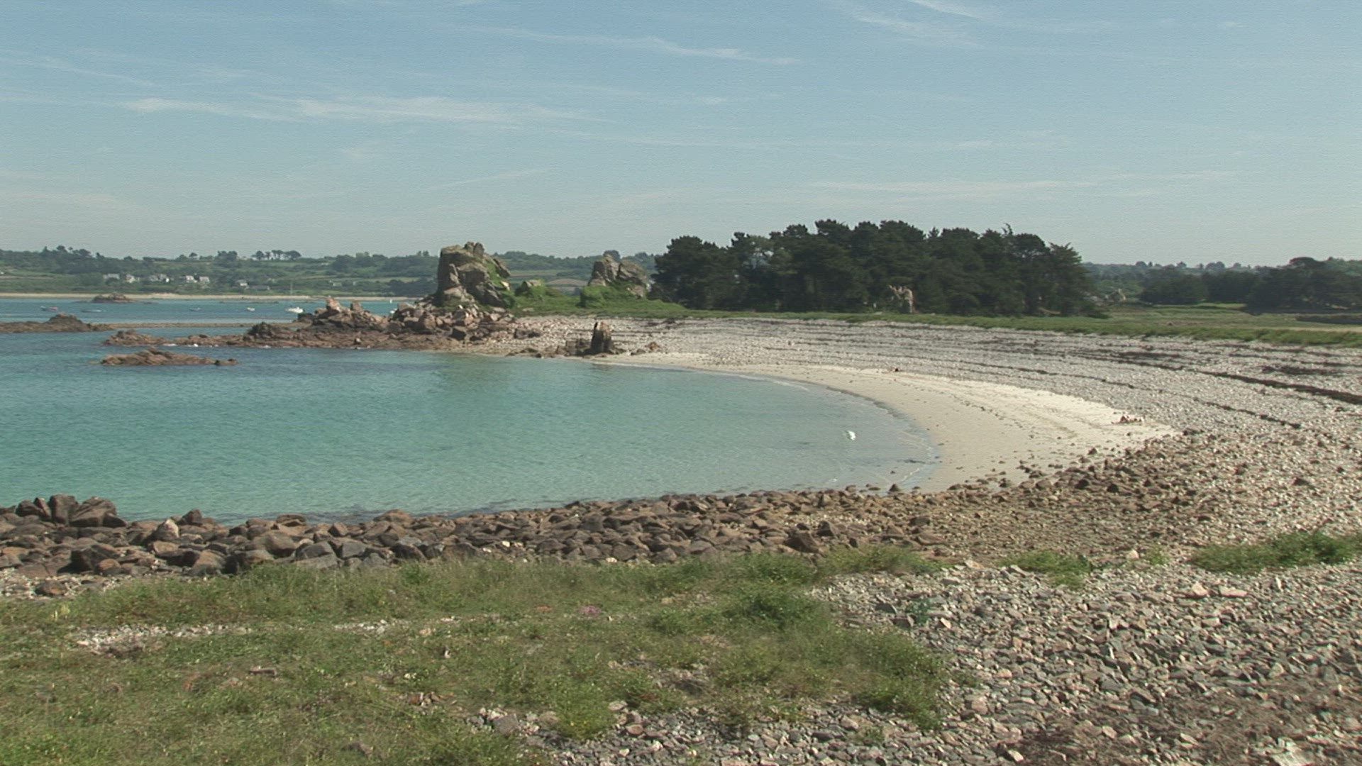 Family of three on pebble beach. Mother and son having fun playing with hands, father sitting quiet and looking at sea