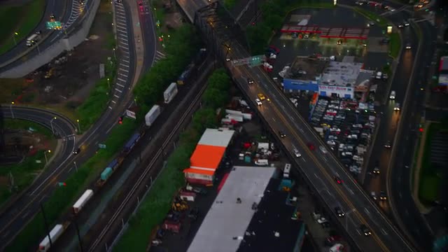 > AERIAL POV over traffic on highway with overpasses and freight train at night