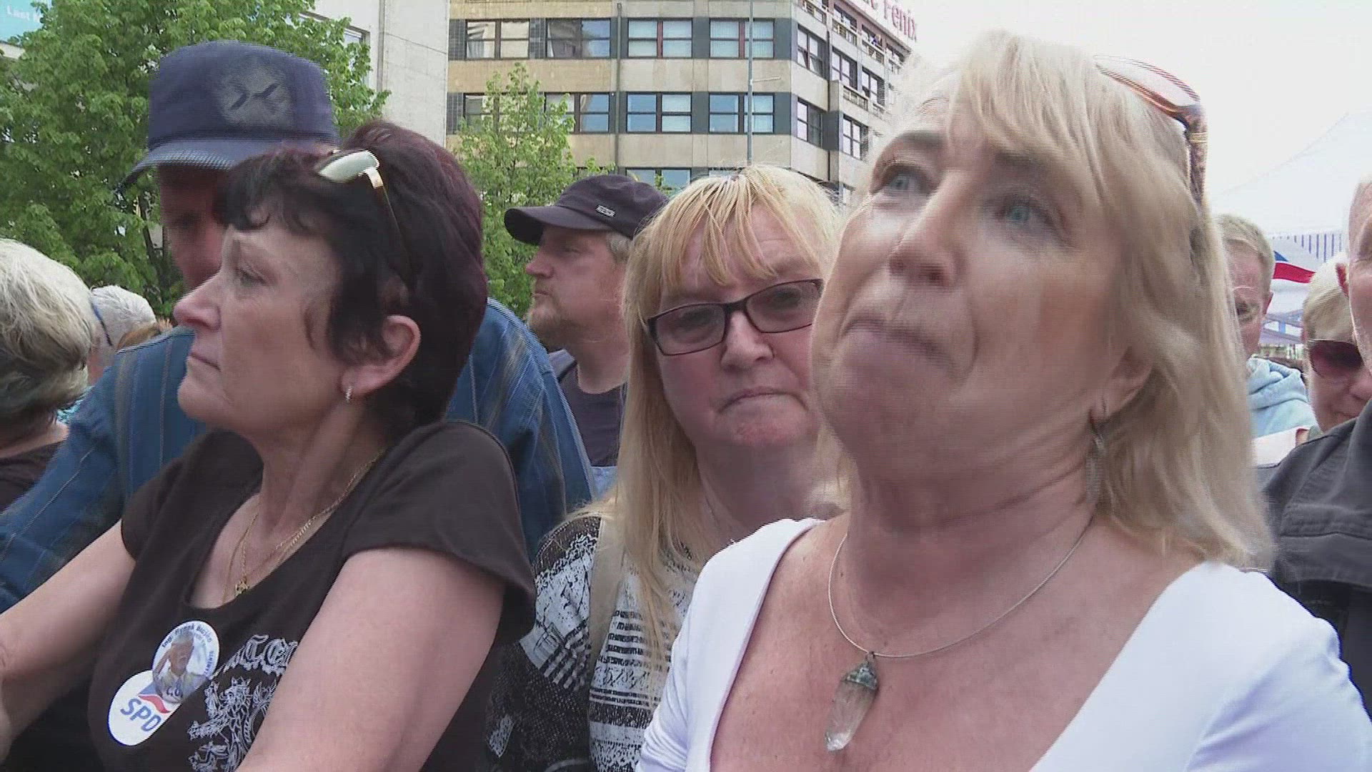Group of pedestrians walking back sidewalk streets of Prague, Czech Republic.