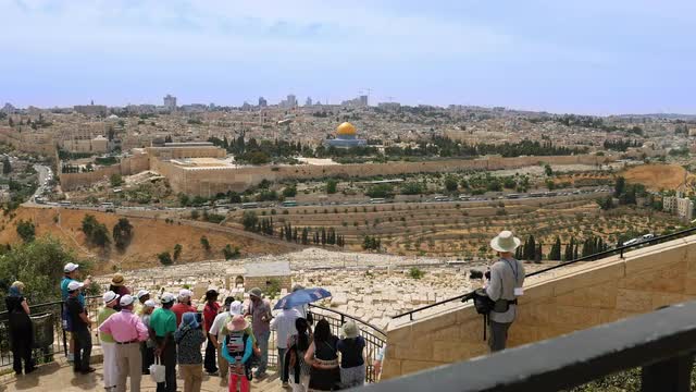782785 - Tourists look at the Jerusalem Old City view